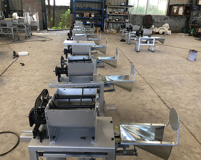 料斗開始上料后,打開電機用手將拖斗拉出,用腳踩住踏板后套上菌袋,松開腳踏板,